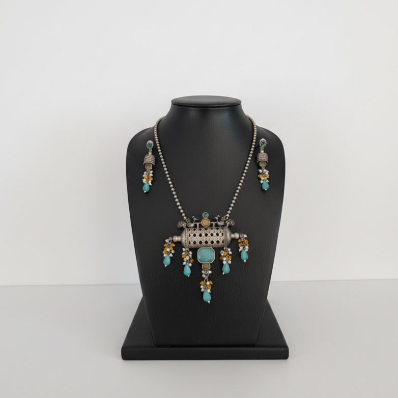 Experience Aarohi, where strength meets elegance in every detail. The intricate silver craftsmanship reflects a rich heritage, while each gem drop captures grace and fluidity. This piece harmoniously blends tradition with bold design, making it a timeless addition that elevates your style with confidence and beauty.