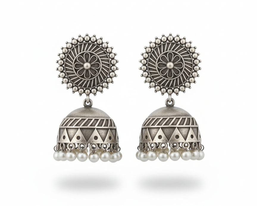Chaandini captures the serene beauty of moonlit nights with its elegant design. Featuring lustrous silver domes paired with delicate pearls, this piece blends timeless heritage with refined grace. Wear Chaandini to add a subtle yet striking glow to your look, embodying quiet sophistication that lasts forever.