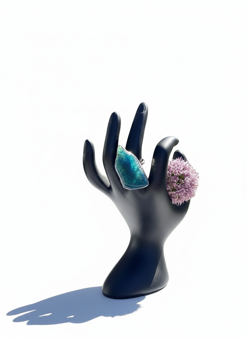 Discover the enchanting Neel Aabha (Blue Glow), featuring a captivating cobalt stone set in elegant oxidized silver. Inspired by Rajasthan's vast blue skies and the soothing monsoon rains, this piece invites you to carry a touch of serene beauty wherever you go. Its unique design combines bold colour with timeless craftsmanship, perfect for adding a captivating glow to your collection. Embrace the spirit of blue and transform your style with this mesmerizing accessory.