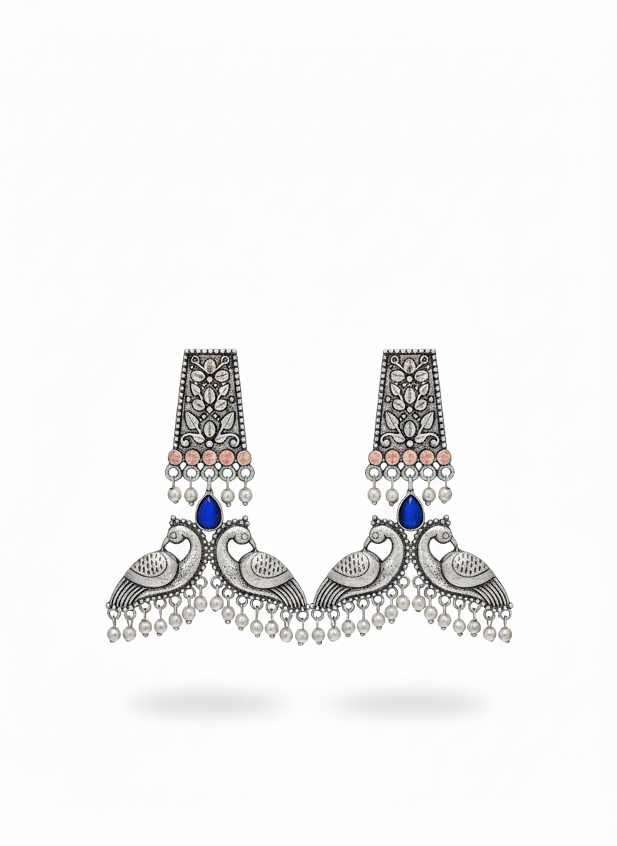 Experience the charm of freedom and joy with the Pakshi Leela oxidized jhumkas. Featuring intricate bird motifs, these earrings symbolize connection, hope, and harmonious movement—much like flocks soaring together. Elevate your style with a design that celebrates unity and vibrant energy, perfect for expressing your unique spirit.