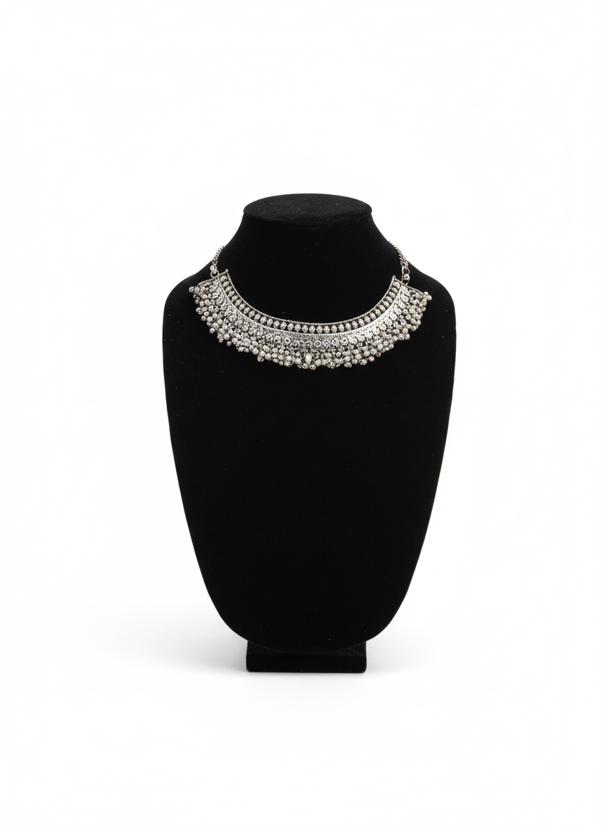 This oxidized silver choker embraces your neck with a commanding presence, elevating your style with bold authority. Its layered metallic texture lends a rich, regal quality, making every outfit feel crowned with heritage and strength. Perfect for those who dare to stand out and own their power.