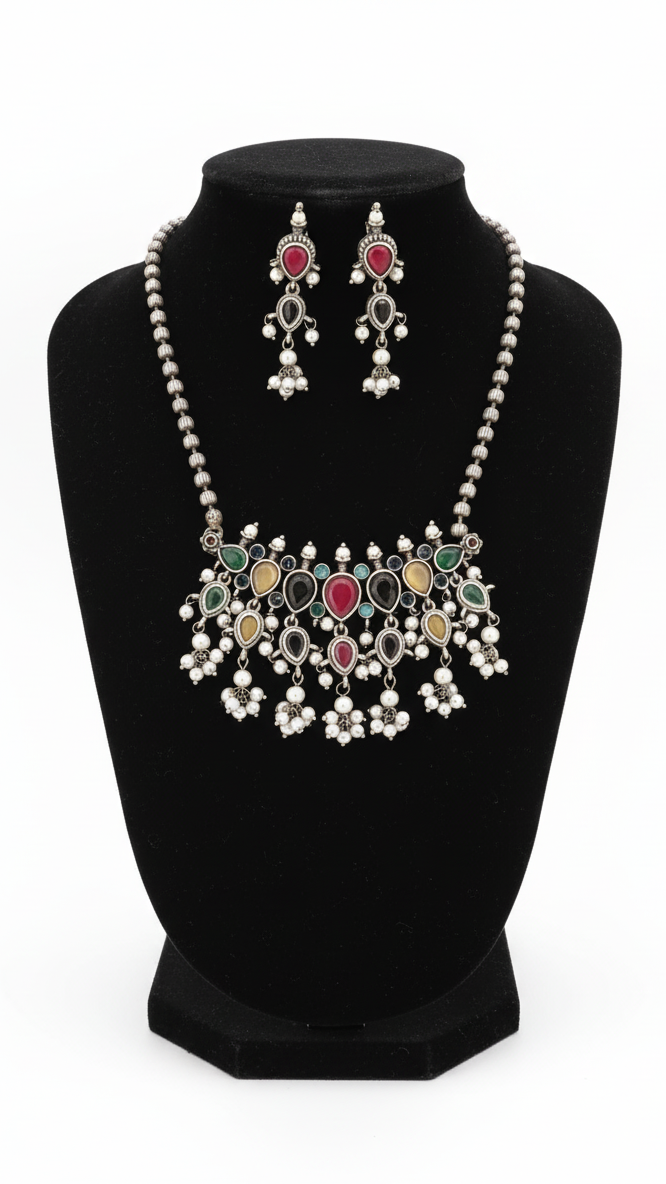 Rang Saaz captures the essence of life through vibrant colors that speak to your joy, strength, and elegance. Each piece is crafted with an oxidized silver base that beautifully highlights every gem, creating a lasting impression like a cherished memory. Celebrate your unique spirit with jewelry that is bold, timeless, and unmistakably you.