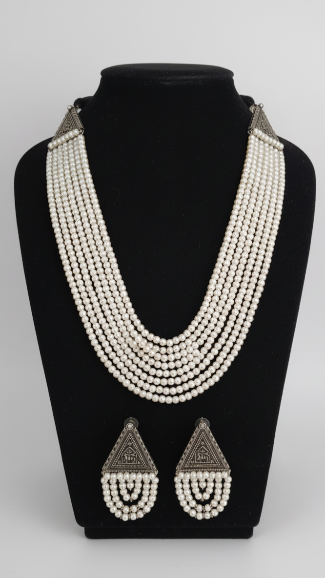 Sitaara Haar captures the serene beauty of starlit nights, blending elegance with subtle sophistication. Its cascading pearls symbolize purity and grace, while intricate silver motifs evoke a sense of timeless royalty. This necklace transcends trends, offering a luminous accessory that adds refinement and charm to any ensemble. Embrace the quiet power of understated elegance with this endlessly graceful piece.