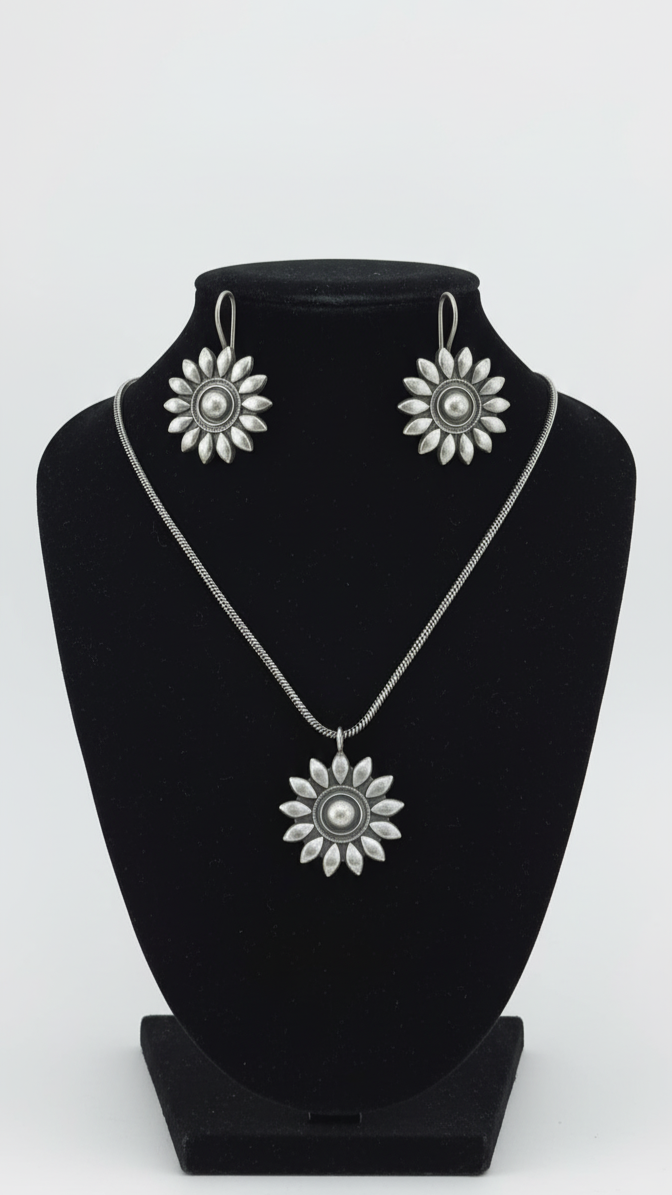 Surya Phool embodies the radiant energy of the sun, symbolizing strength and renewal. Crafted in oxidized silver, each petal represents resilience and unwavering hope, making it a powerful reminder to rise again, no matter the challenges. This timeless piece quietly celebrates enduring spirit and inner light, perfect for those who embrace strength that never fades.