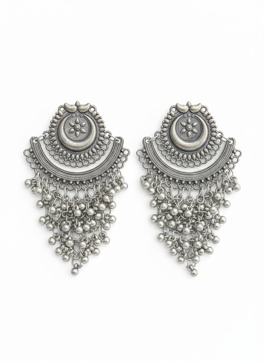 Inspired by the sacred temples of Vrindavan, these oxidized earrings capture the essence of devotion and celebration. Their timeless design blends spiritual symbolism with versatile style, making them perfect for daily wear or special occasions. Add a touch of meaningful elegance to your look with these captivating Vrindavan Bells.