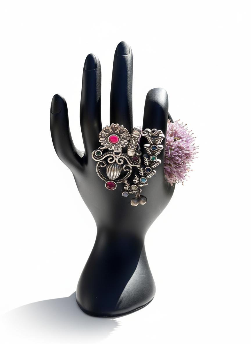 Inspired by Jaipur’s regal charm, the Whisper of Jaipur ring beautifully reflects the city's rich heritage through its intricate oxidized design. Each delicate curve echoes the timeless elegance of royal palaces, making it more than just an accessory—it’s a piece of history to carry with you. Embrace the romance and grace of the Pink City every time you wear this uniquely crafted ring.