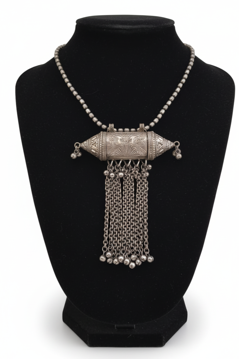 Zar Tasveer transforms metal into a living story, where intricate carvings seamlessly merge with flowing chains that move with you. Drawing inspiration from tribal heirlooms, this piece embodies strength and timeless artistry, connecting you to rich traditions and enduring narratives. Embrace a statement that celebrates heritage and craftsmanship every time you wear it.